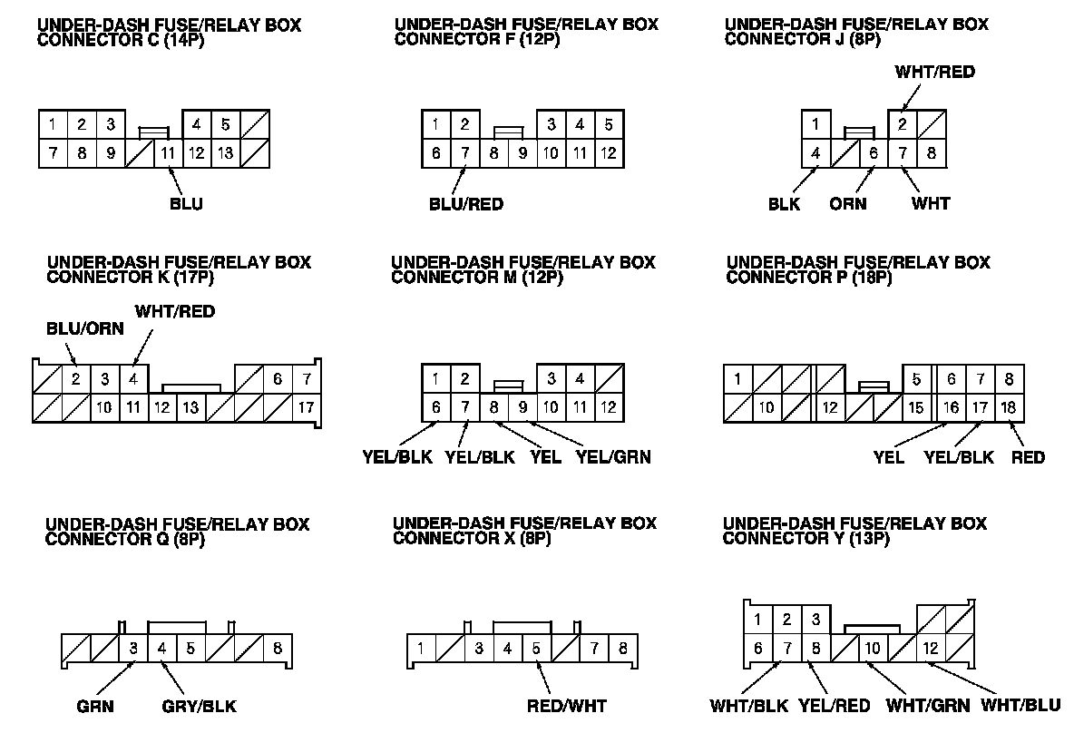 2. Disconnect under-dash fuse/relay box connectors C, F, J, K, M, P, Q, X and Y.