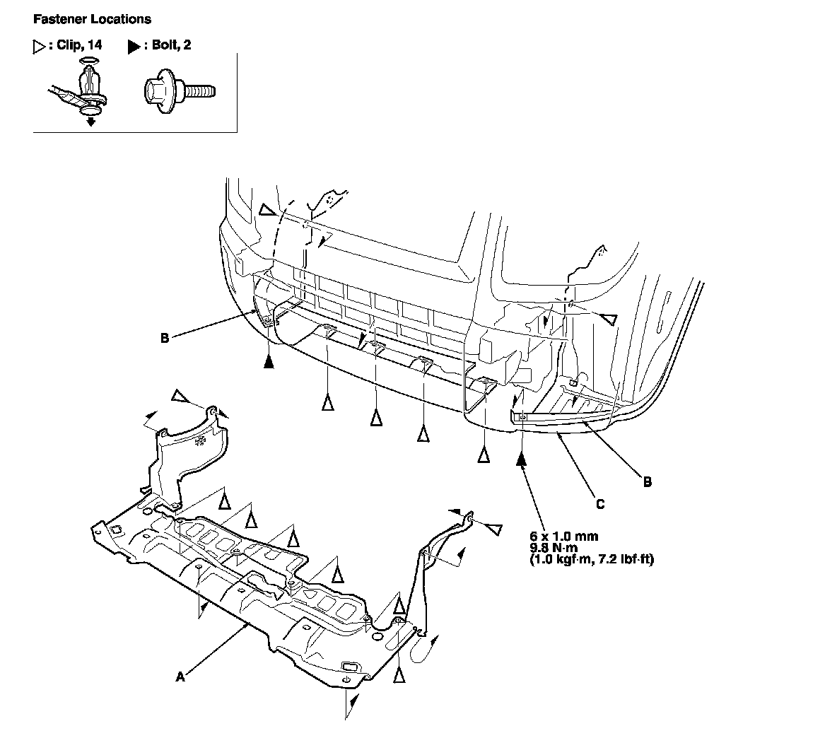 -2 From under the front bumper (C), remove the clips and the bolts.