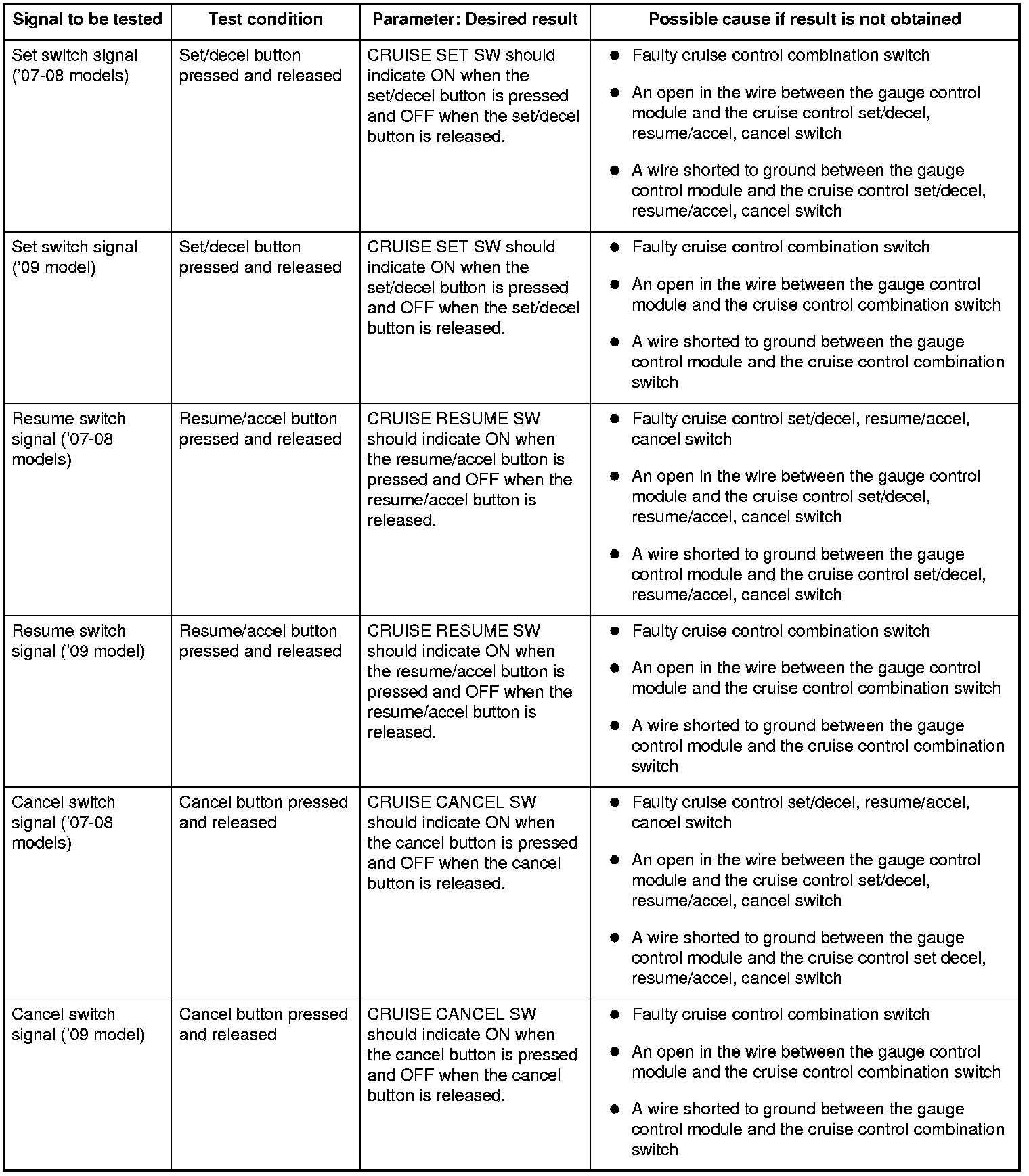 NOTE: Intermittent failures are often caused by loose circuit connections. While monitoring cruise control inputs, flex the circuit wires, and note if any of the test results change.