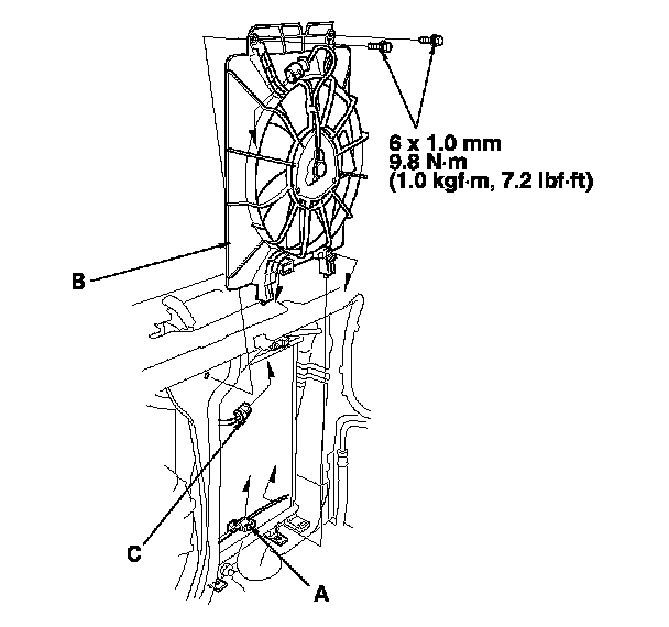 8. Remove the A/C compressor clutch connector (A) from the A/C condenser fan shroud (B), then open the wire harness clip. Disconnect the A/C condenser fan connector (C). Remove the upper mounting bolts and the A/C condenser fan shroud. Be careful not to damage the radiator fins when removing the A/C condenser fan shroud.