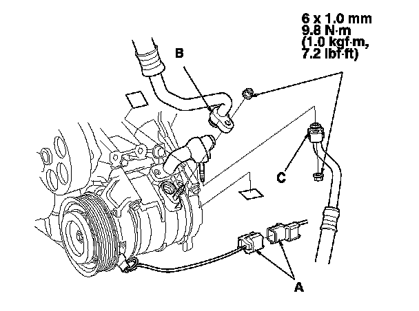 9. Disconnect the A/C compressor clutch connector (A), remove the nuts, then disconnect the suction line (B) and the discharge line (C) from the A/C compressor. Plug or cap the lines immediately after disconnecting them to avoid moisture and dust contamination.