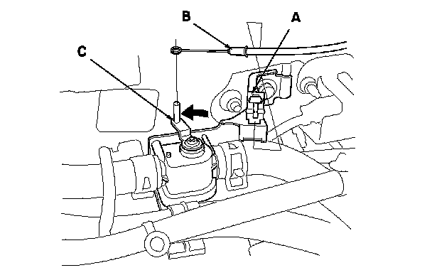 3. From under the hood, open the cable clamp (A), then disconnect the heater valve cable (B) from the heater valve arm (C). Turn the heater valve arm to the fully opened position as shown.