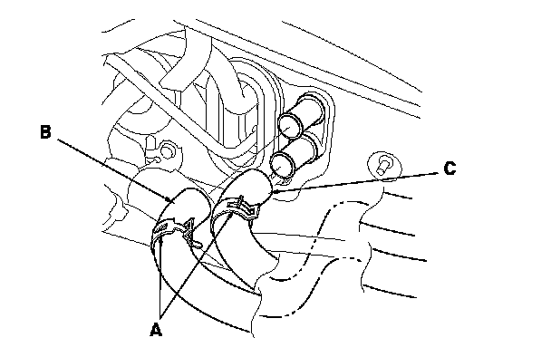 5. Slide the hose clamps (A) back, then disconnect the inlet heater hose (B) and the outlet heater hose (C) from the heater core. Engine coolant will run out when the hoses are disconnected; drain it into a clean drip pan. Be sure not to let engine coolant spill on the electrical parts or the painted surfaces. If any coolant spills, rinse it off immediately.