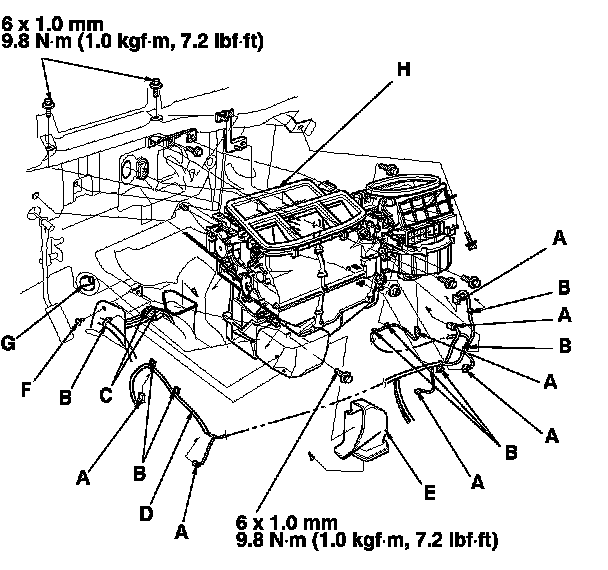 9. Disconnect the connectors (A) from the dashboard wire harness, the air mix control motor, the evaporator temperature sensor, the power transistor, the mode control motor, the blower motor, and the recirculation control motor, then remove the wire harness clips (B), the connector clips (C), the wire harness (D), the heater duct (E), and the clip (F). Disconnect the drain hose (G), then remove the mounting nuts and the blower-heater unit (H).