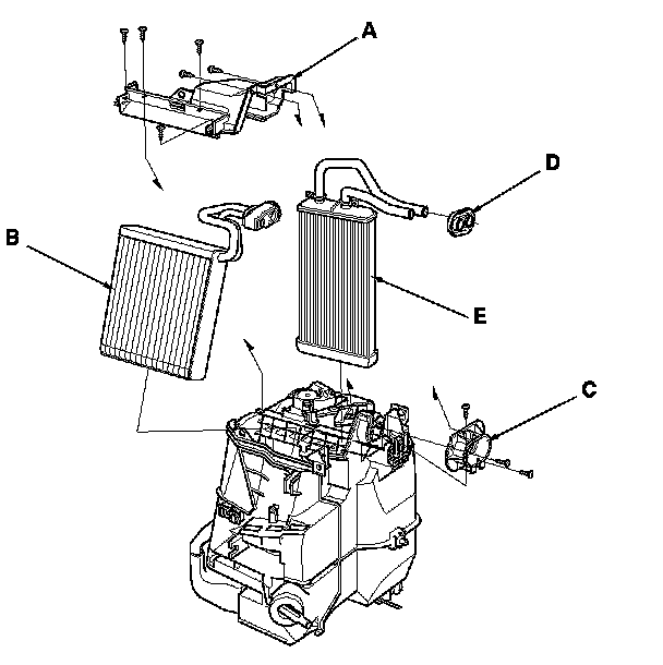 10. Remove the self-tapping screws and the expansion valve cover (A). With air conditioning; carefully pull out the evaporator core (B) so you don't bend the inlet and outlet lines. Remove the self-tapping screws and the flange cover (C), then remove the grommet (D), and carefully pull out the heater core (E) so you don't bend the inlet and outlet lines.