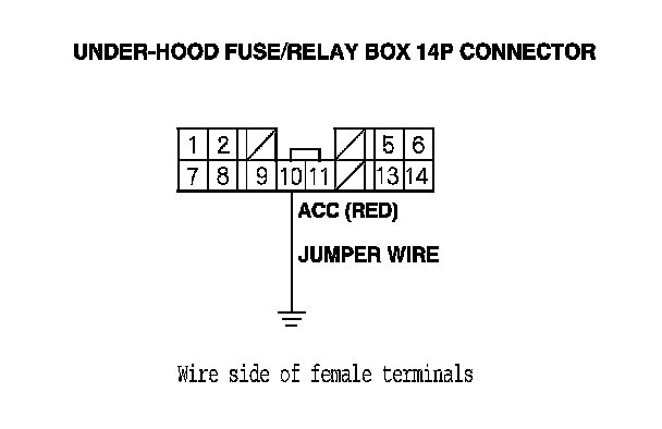 9. Momentarily connect under-hood fuse/relay box 14P connector terminal No. 10 to body ground with a jumper wire several times.