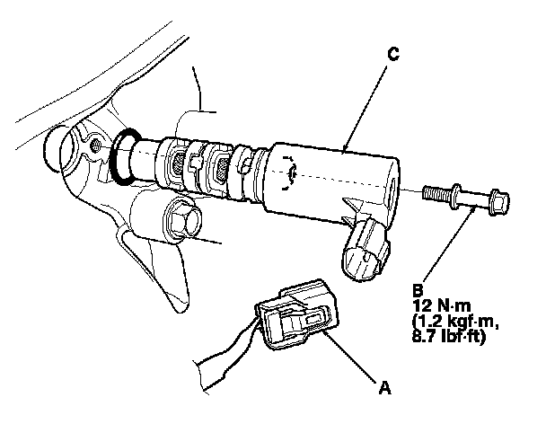 2. Remove the bolt (B) and the VTC oil control solenoid valve (C).
