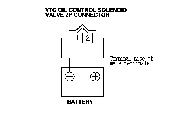 3. Connect VTC oil control solenoid valve 2P connector terminal No. 2 to the battery positive terminal with a jumper wire. Connect VTC oil control solenoid valve 2P connector terminal No. 1 to the battery negative terminal with a jumper wire.