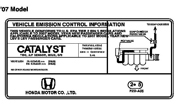 THIS VEHICLE CONFORMS TO U.S. EPA TIER 2 BIN 5 REGULATIONS APPLICABLE TO 2007 MODEL YEAR NEW PASSENGER CARS AND CALIFORNIA REGULATIONS APPLICABLE TO 2007 MODEL YEAR NEW LEV II LEV PASSENGER CARS.