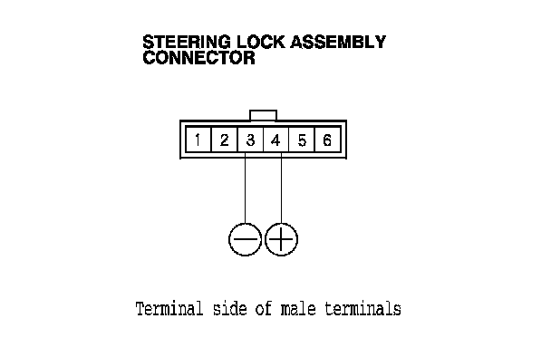 4. Connect the battery positive terminal to steering lock assembly connector terminal No. 4, and connect the battery negative terminal to No. 3 terminal. Make sure that the ignition switch cannot be turned to LOCK (0). Release the battery terminals, and make sure that the ignition switch can be turned to LOCK (0) and removed from the cylinder.