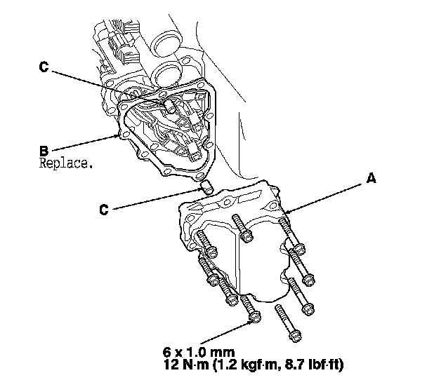 5. Remove the shift solenoid valve cover (A), the gasket (B), and the dowel pins (C).