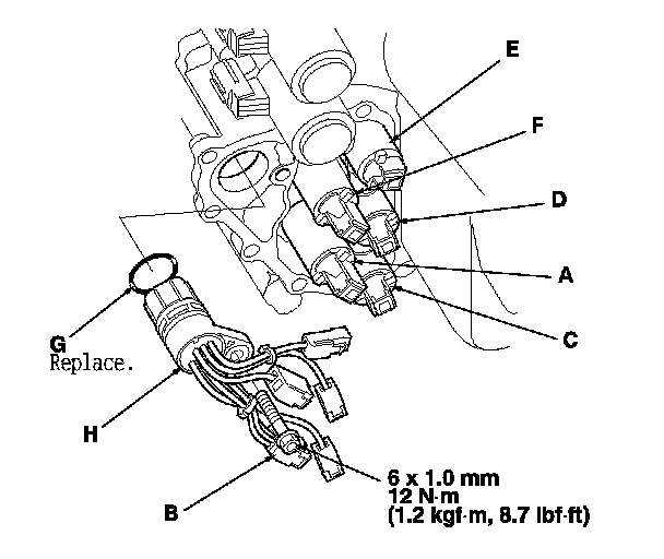 12. Install the new O-ring (G) on the shift solenoid harness connector (H), and install the connector in the transmission housing.