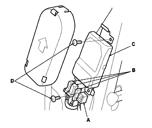 1. Place the ODS unit (A) on the seat-back frame. Tighten the two screws (B), and connect the ODS unit harness 18P connector (C) and the OPDS sensor connectors (D) to the ODS unit.