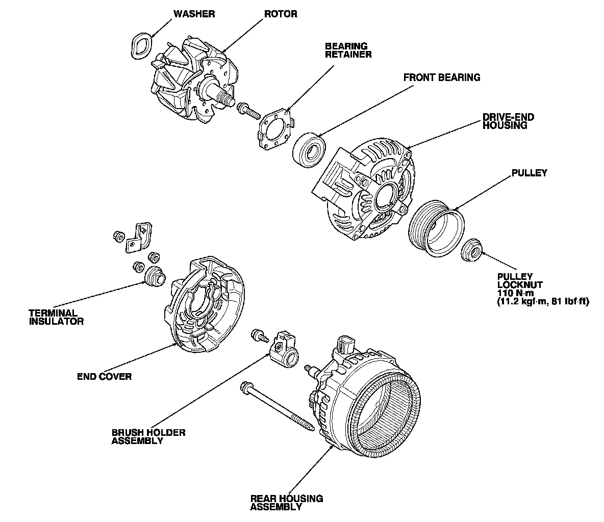 16. If you removed the pulley, put the rotor in the drive-end housing, then tighten its pulley locknut to 110 N-m (11.2 kgf-m, 81.0 lbf-ft).
