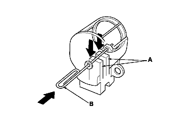19. Push the brushes (A) in, then insert a pin or drill bit (B) (about 1.6 mm (0.06 in.) diameter) to hold them there.