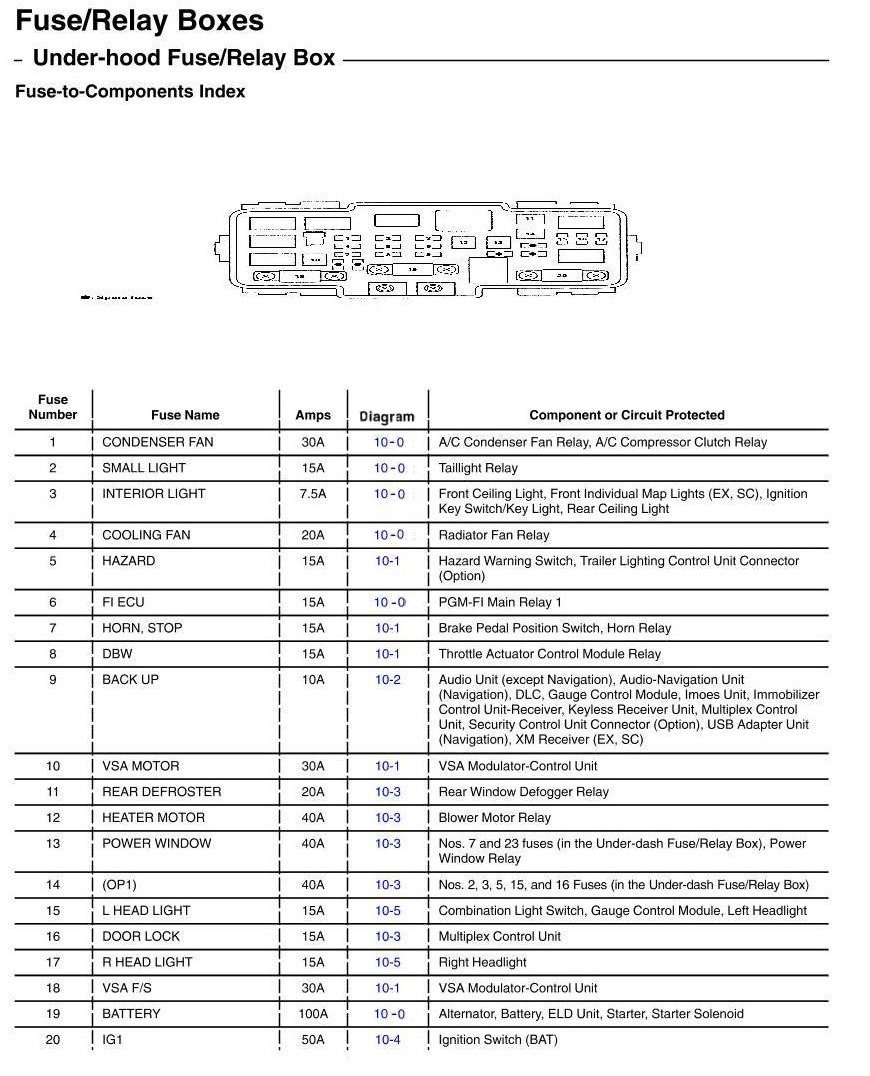 Under-Hood Fuse/Relay Box - Fuse-to-Components Index