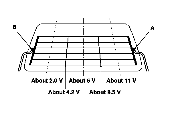 1. Measure the voltage between the positive terminal (A) and body ground with the ignition switch turned to ON (II) and the defogger switch ON.