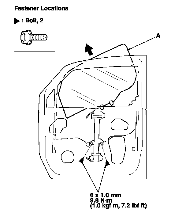 2. Carefully lower the glass (A) until you can see the bolts, then remove them. Carefully pull the glass out through the window slot. Take care not to drop the glass inside the door.