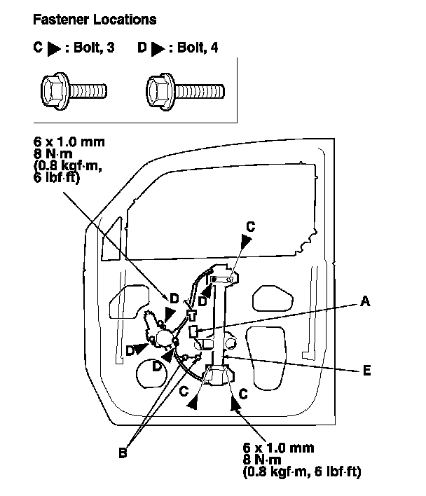 4. Remove the bolts (C), and loosen the bolts (D), then remove the regulator (E) through the hole in the door.