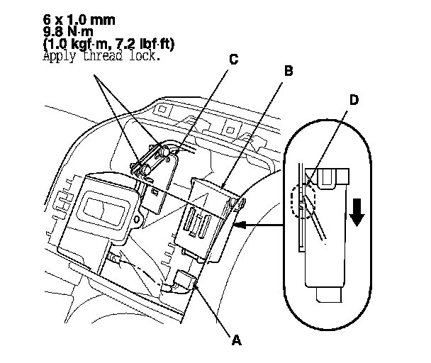 NOTE: To disconnect the TPMS control unit from its bracket, insert a small flat-tipped screwdriver between the TPMS control unit and the bracket shown in (D) to release the hook, then slide out the TPMS control unit.
