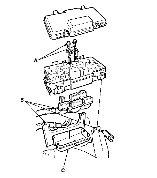 3. Release the tab (B), and then remove the bottom cover (C) from the under-hood fuse/relay box.