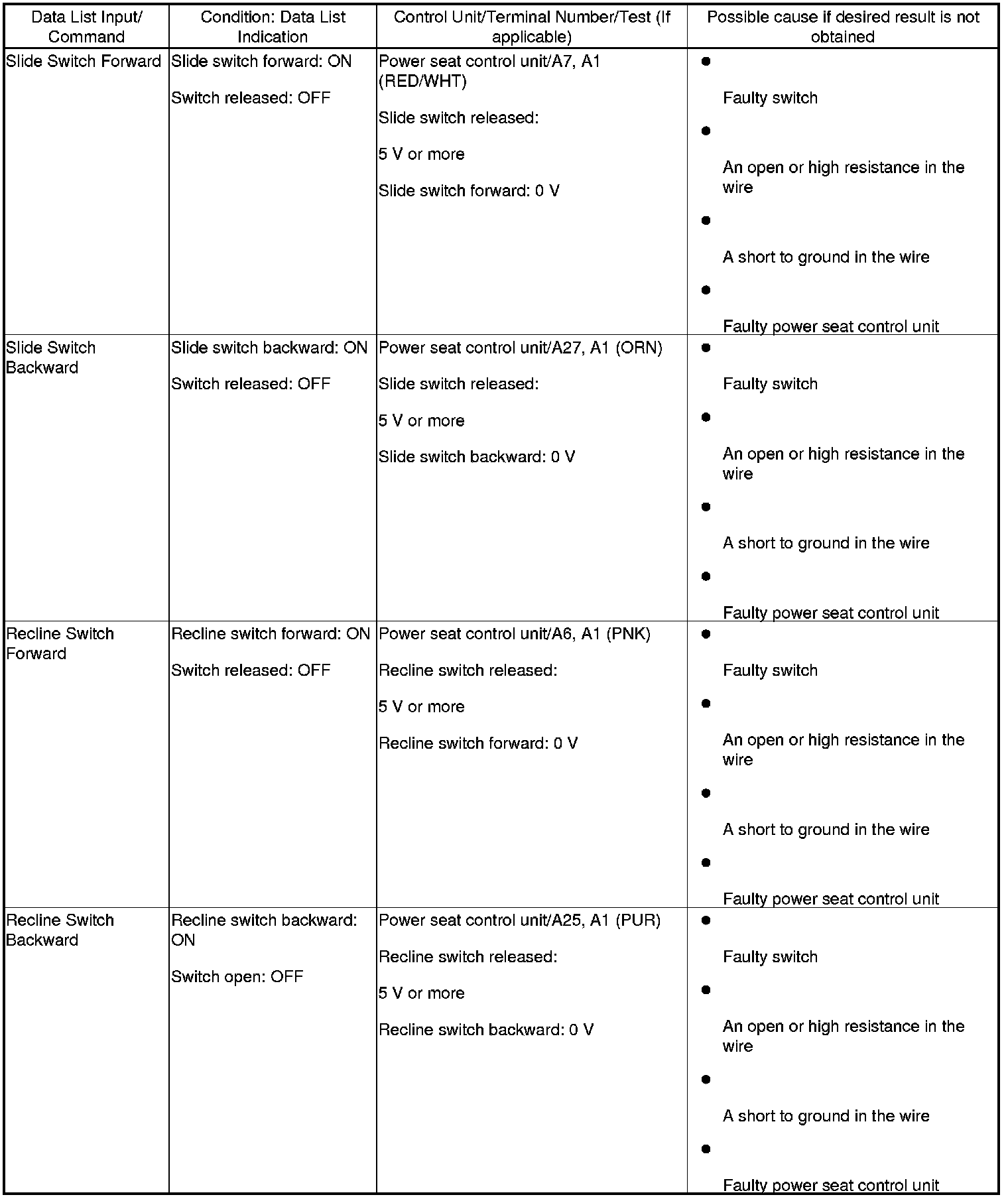 - If the data list indication is not correct, perform the appropriate test at the control unit and terminal indicated in the table.