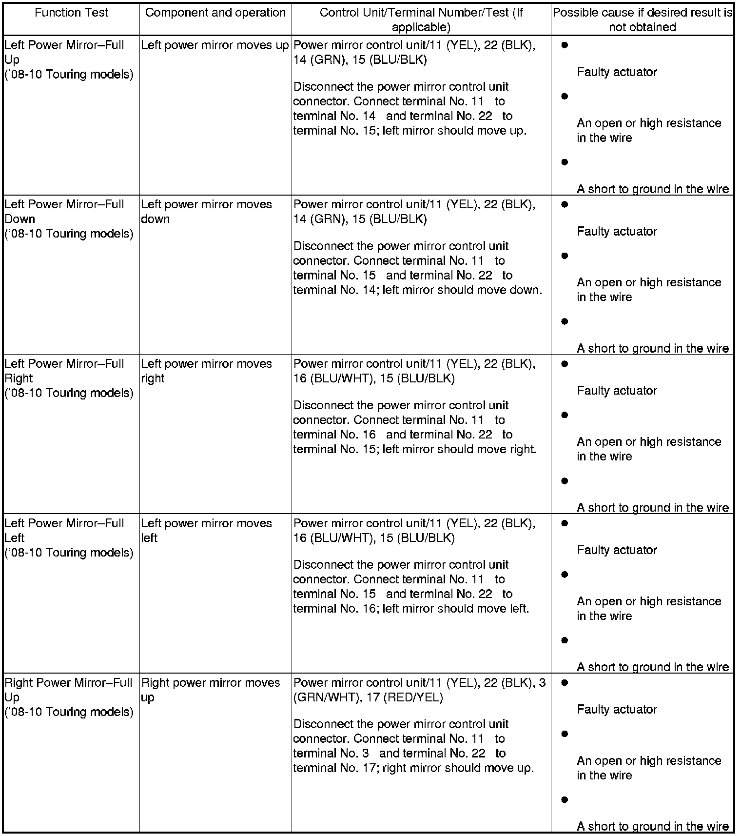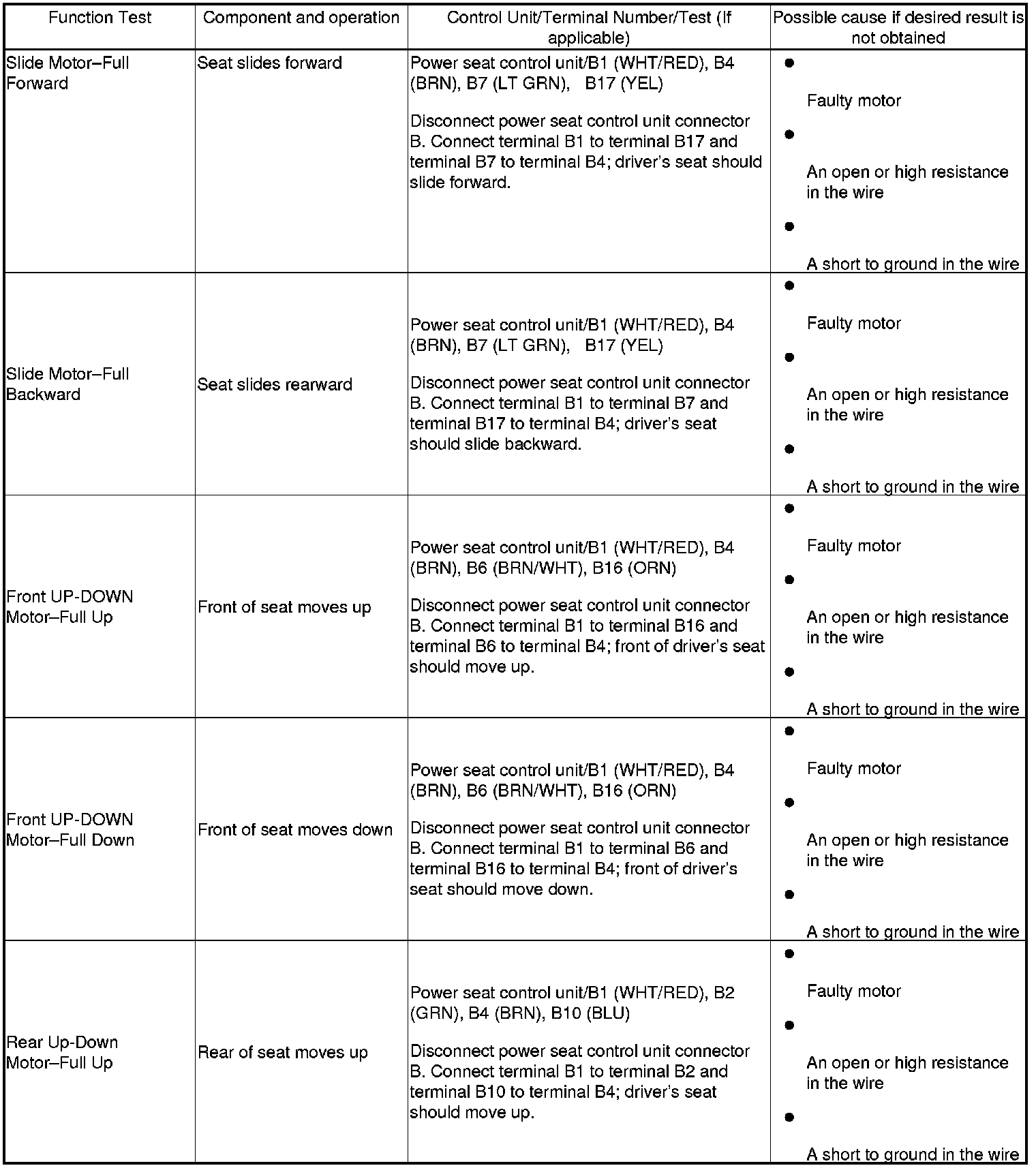 - If the function does not operate normally, perform the appropriate test at the control unit and terminal indicated in the table.