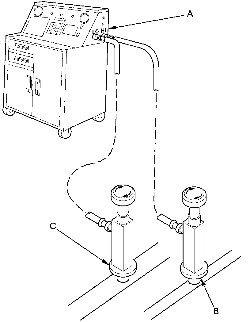 1. Connect an R-134a refrigerant recovery/recycling/charging station (A) to the high-pressure service port (B) and the low-pressure service port (C), as shown, following the equipment manufacturer's instructions.