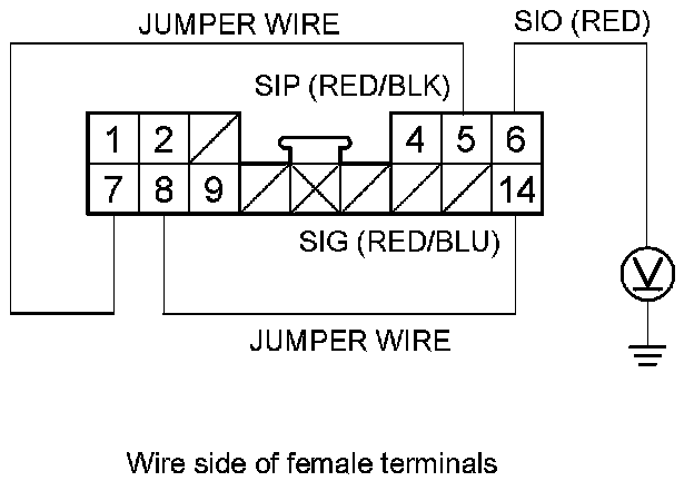 6. Connect a voltmeter and jumper wires as shown, then turn the ignition switch to ON (II) and do this input test at the following connector.
