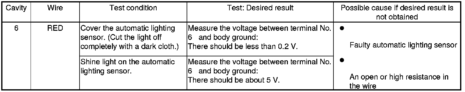 5. Reconnect the automatic lighting control unit connector, then do these input tests at the following connectors.