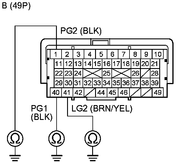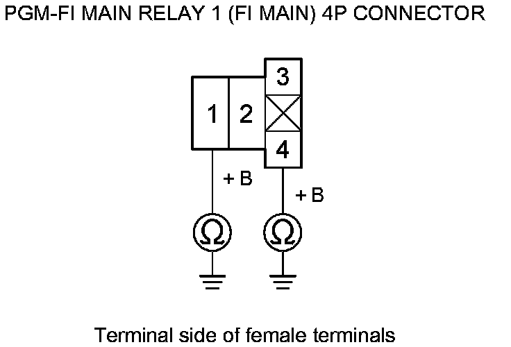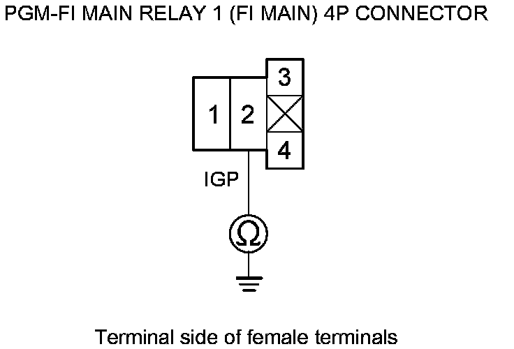 37. Check for continuity between body ground and PGM-FI main relay 1 (FI MAIN) 4P connector terminals No. 1 and No. 4 individually.