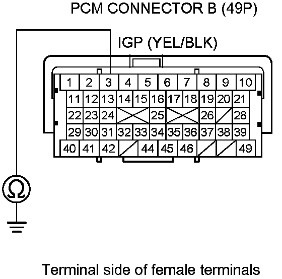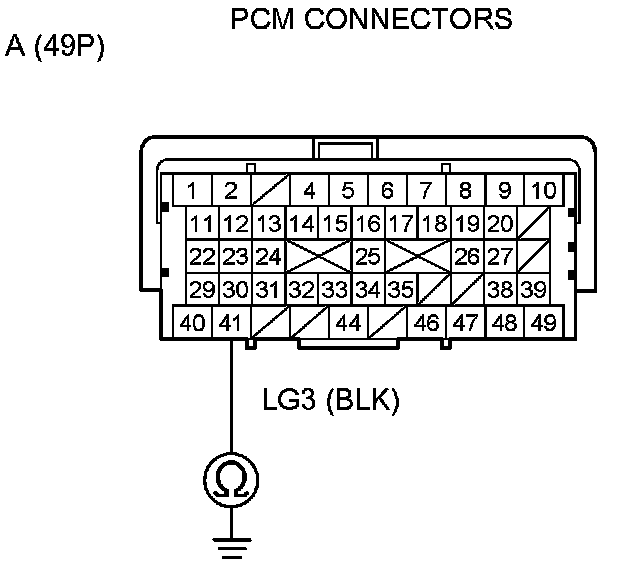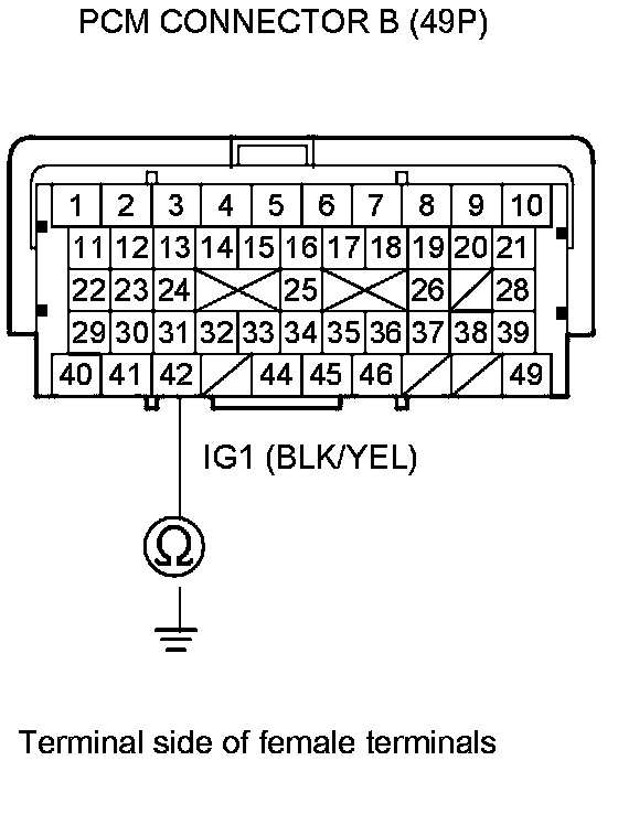 48. Check for continuity between PCM connector terminal B42 and body ground.