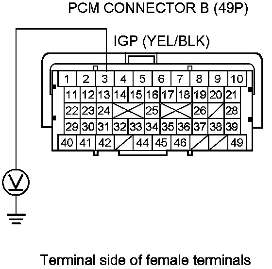 56. Measure the voltage between PCM connector terminal B42 and body ground.
