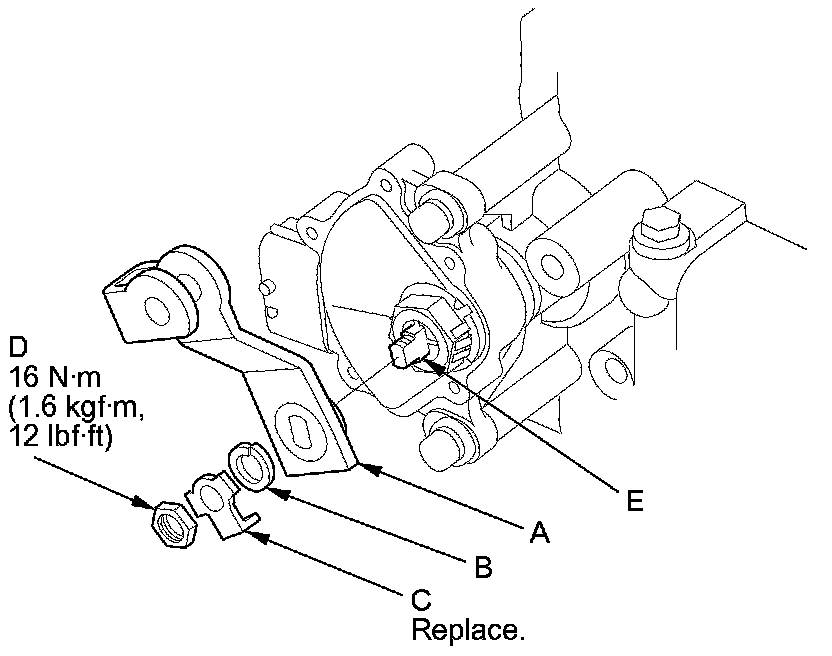 16. Install the selector control lever (A), the spring washer (B), a new lock washer (C), and the locknut (D) on the selector control shaft (E).