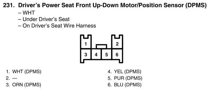 View 231 - Driver's Power Seat Front Up-Down Motor/Position Sensor Connector View (DPMS)