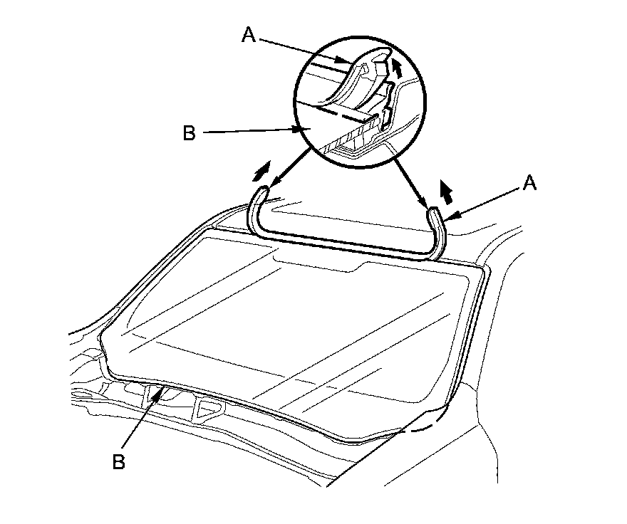 2. Remove the molding (A) from the upper edge of the windshield (B). If necessary, cut the molding with a utility knife.
