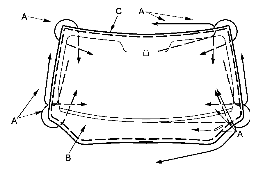 Carefully cut through the rubber dam and adhesive (C) around the entire windshield.