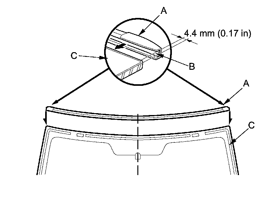 13. Attach the molding (A) with adhesive tape (B) to the upper edge of the windshield (C). Be careful not to touch the windshield where the adhesive will be applied.