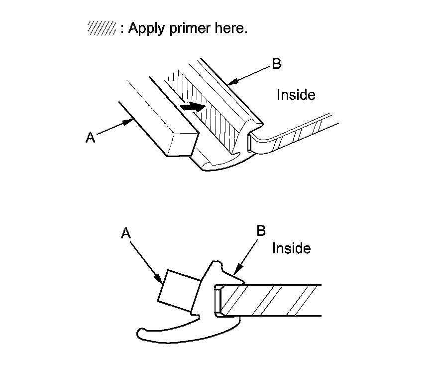 14. Attach the molding upper seal (A) with adhesive tape to the inside surface of the molding (B) as shown.
