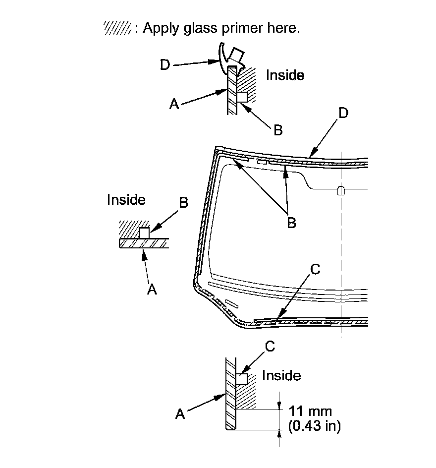 17. With a sponge, apply a light coat of glass primer around the edge of the windshield (A) between the dams (B, C) and molding (D) as shown, then lightly wipe it off with gauze or cheesecloth: