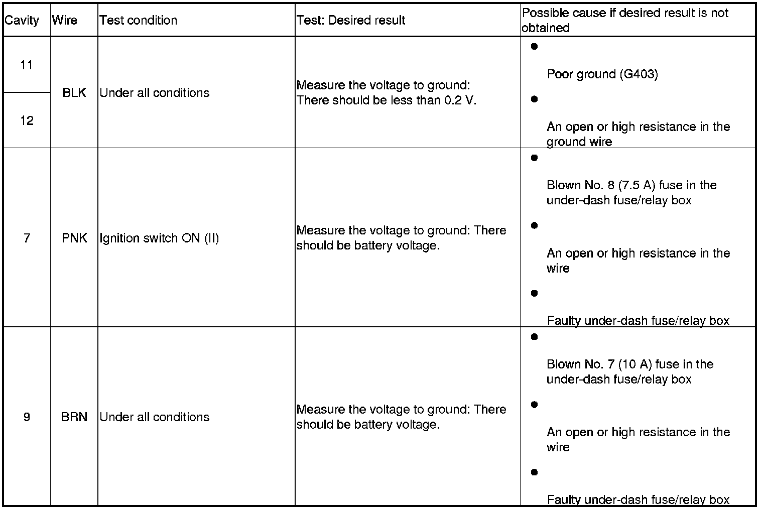 NOTE: Before testing, troubleshoot the multiplex integrated control unit first, using B-CAN System Diagnosis Test Mode A Troubleshooting - B-CAN System Diagnosis Test Mode A.