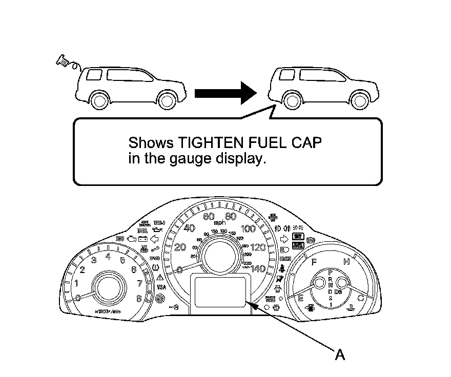 The first time a leak is detected, a TIGHTEN FUEL CAP (multi-information display model) (CHECK FUEL CAP (odometer/outside temperature display model)) message appears on the gauge display (A). To scroll to another message, press the select/reset button. The TIGHTEN FUEL CAP/CHECK FUEL CAP message appears each time you restart the engine until the system turns the message off. Turn the engine off, then replace or tighten the fuel fill cap until it clicks at least once.