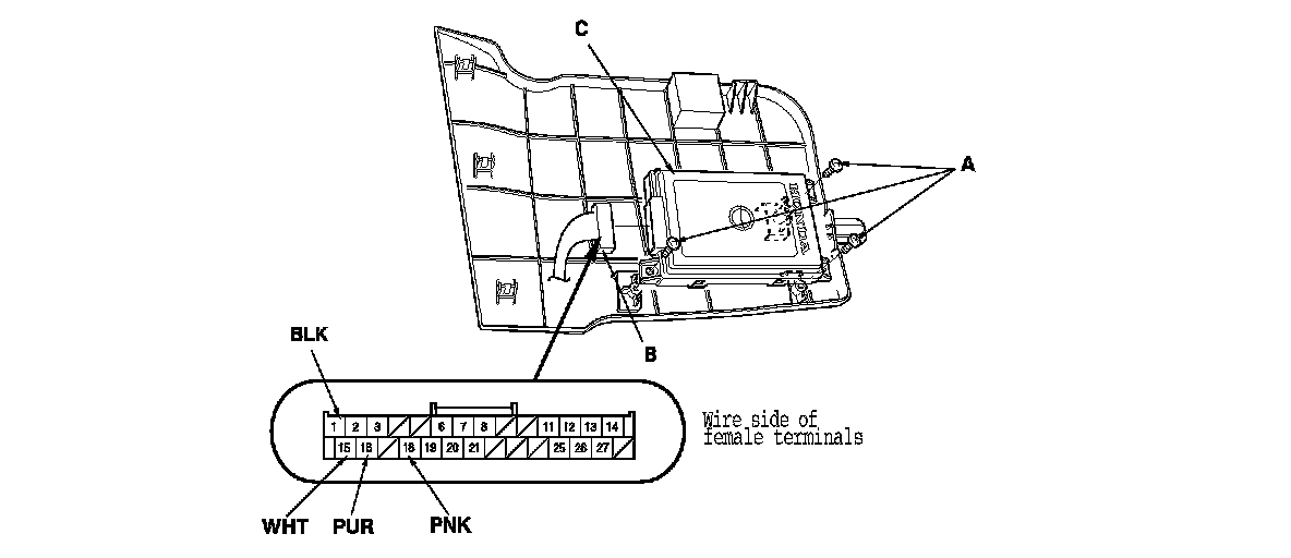 2. Remove the HFL control unit screws (A), then disconnect the 28P connector (B) from the HandsFreeLink control unit (C).