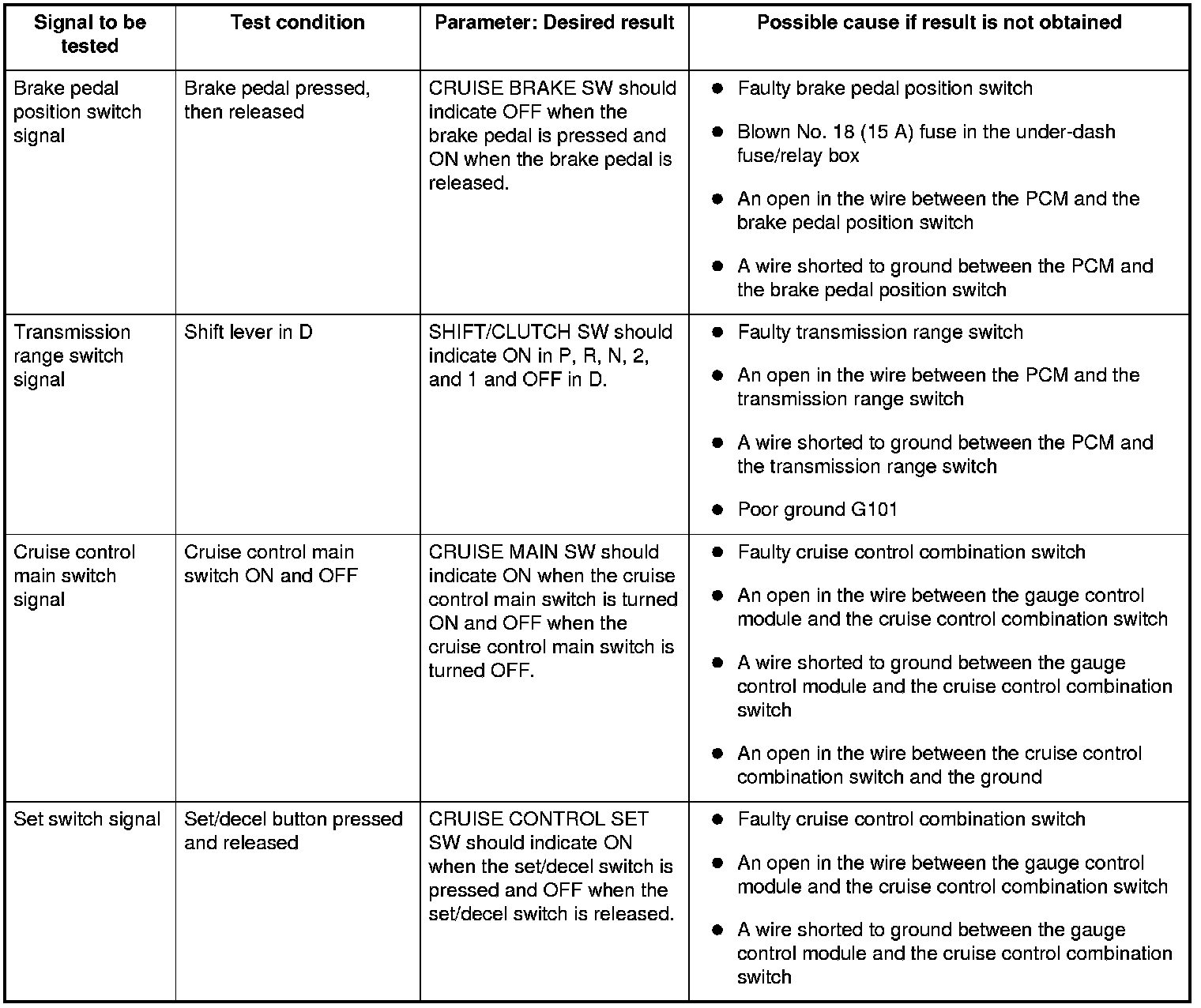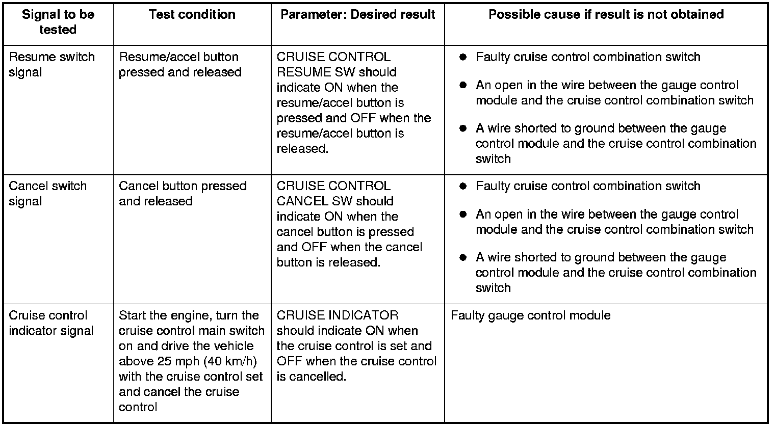 NOTE: Intermittent failures are often caused by loose circuit connections. While monitoring cruise control inputs, flex their circuit wires, and note if any of the test results change.