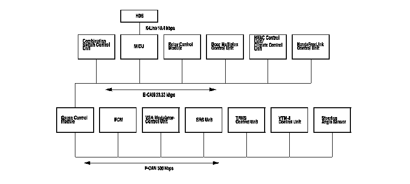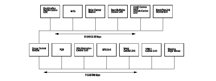 The ECUs on the B-CAN and the F-CAN transmit and receive information in the form of structured messages that may be received by several different ECUs on the network at one time. These messages are transmitted and received across a communication circuit that consists of a single wire that is shared by all the ECUs on the circuit. Since messages on the F-CAN are typically of higher importance, a second wire is used for communication circuit integrity monitoring. A backup circuit is also added to the headlight and wiper circuits on the B-CAN in the event of a network wire or ECU failure that would effect the operation of the system.