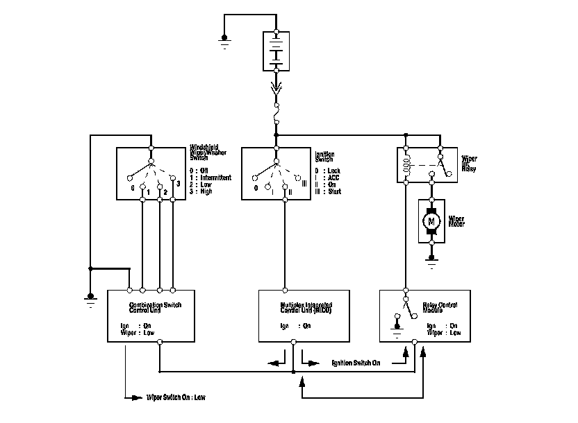 Messages are transmitted by an ECU (that monitors an input) over the communication circuit. ECUs that use the message (information related to that input) are the receivers. For example, the combination switch control unit monitors the wiper switch. When the wiper switch is placed in the low speed position, the combination switch control unit transmits that message on the communication circuit. The relay control module receives the message and turns on the wipers by providing a ground for the relay.