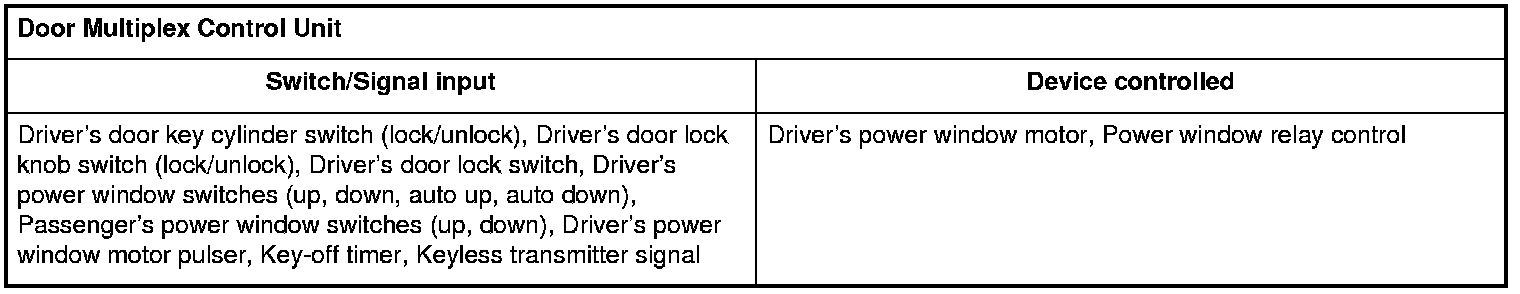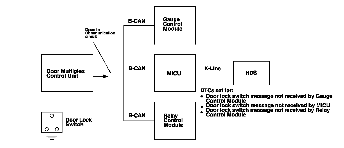 Since there is a break in the communication circuit, the door lock switch message could not be received by the gauge control module, multiplex integrated control unit (MICU), or the relay control module. Each of these units will set "loss of communication" error codes for the message(s) they did not receive. There may be multiple communication DTCs if the unit that has become disconnected from the network would normally transmit multiple messages during the communication line test. For example, the door multiplex control unit sends the keyless panic message and door lock switch message during the communication circuit test.