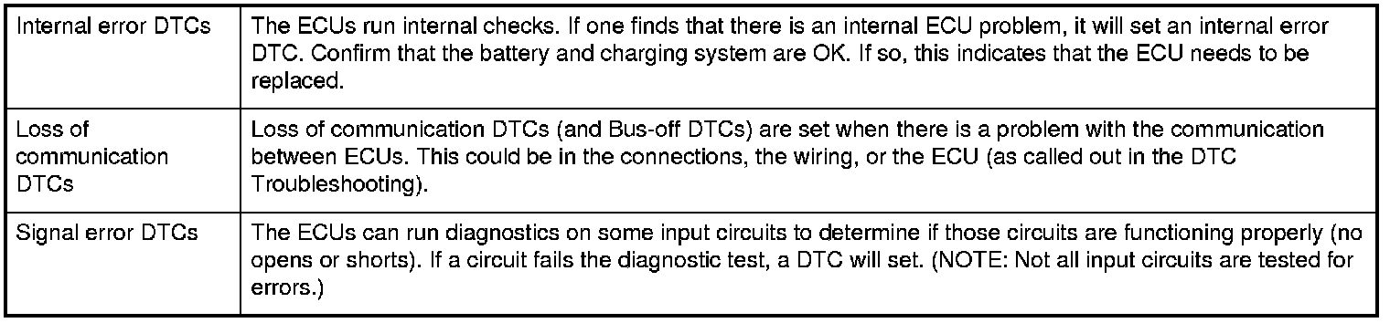 The B-CAN and the F-CAN send messages to each other to check the integrity of the network communication circuit. They do this by sending a specific digital message out after an event. For example, after turning the ignition switch to ON (II). All the ECUs on the communication circuit expect to receive a message from other specific units within a specified amount of time. If the message is not received, the ECU will transmit a DTC reporting that it did not receive the message.