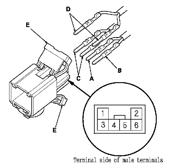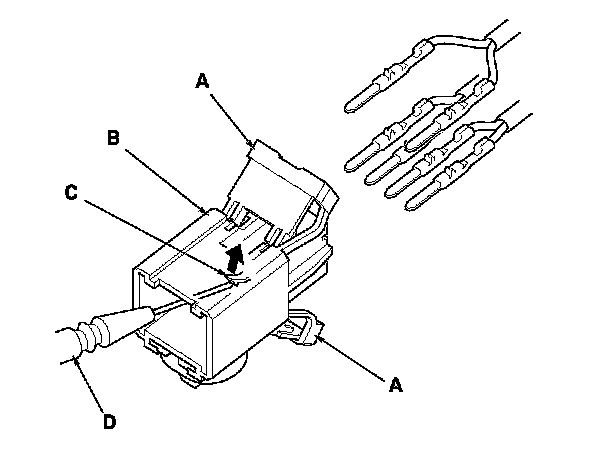 4. Remove the terminal from the connector by pushing the lock tab (C) up in the connector using a thin blade screwdriver (D). Remove all six terminals, and replace the connector.