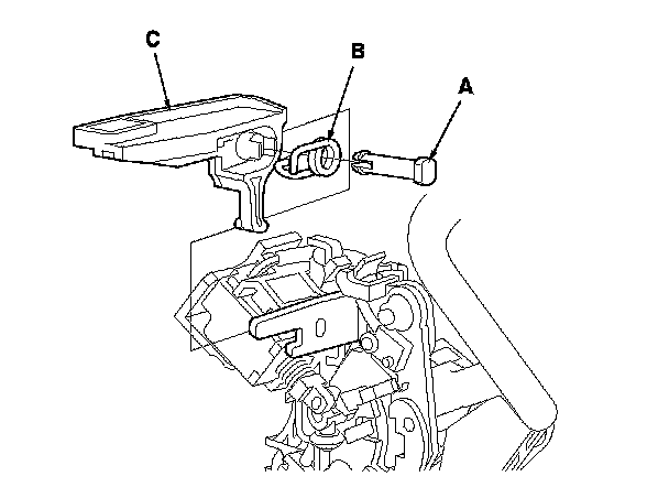5. Remove the shift lock release pin (A), spring (B), and the shift lock release (C).